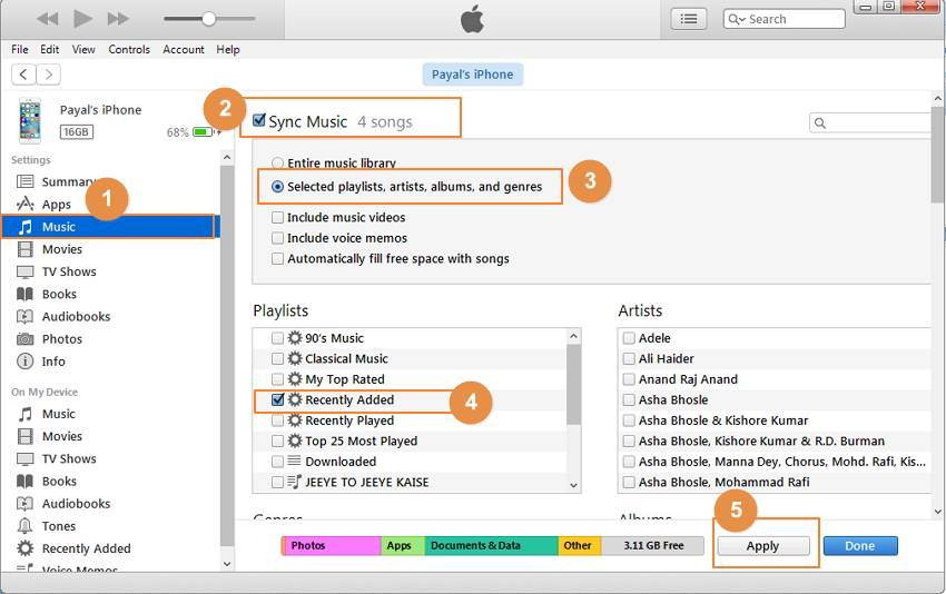 Кроме того можно также добавить песни путем синхронизации устройства. Для этого нажмите на подключенном iPhone, а затем выберите вариант «Музыка» на левой стороне меню. Теперь установите флажок «Синхронизировать музыку» и включить опцию «Избранные плейлисты, артисты, альбомы и жанры.» Далее выберите песни на основе плейлиста или художников, а затем нажмите «Применить». Песни будут синхронизироваться с iPhone.