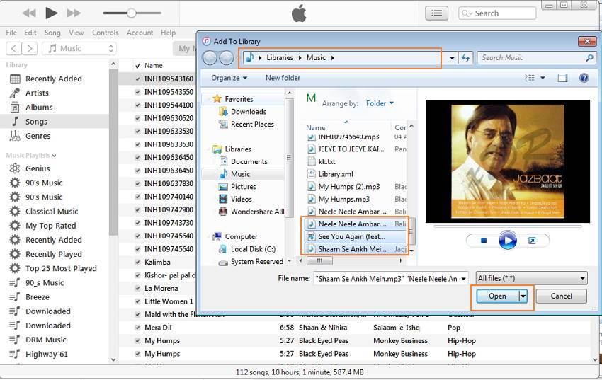Затем выберите песни из компьютера, который вы хотите добавить, а затем нажмите на «Открыть».