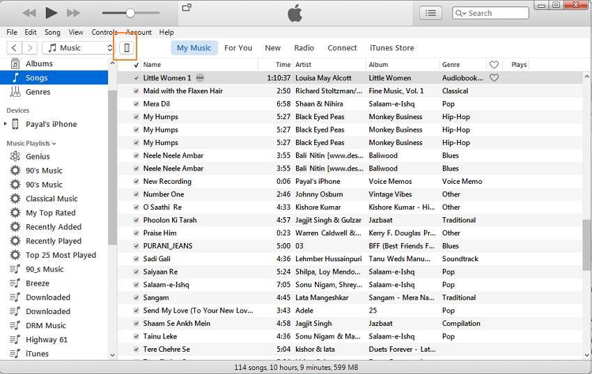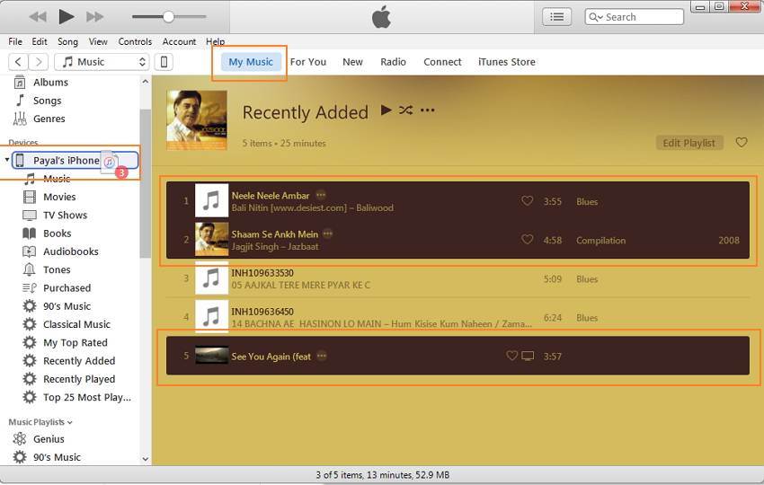 Затем нажмите на «Моя музыка» и появится список песен в медиатеке iTunes. Выберите песни, которые вы хотите передать на iPhone. Перетащите песни с правой боковой панели и поместите их на iPhone значок на левой стороне.