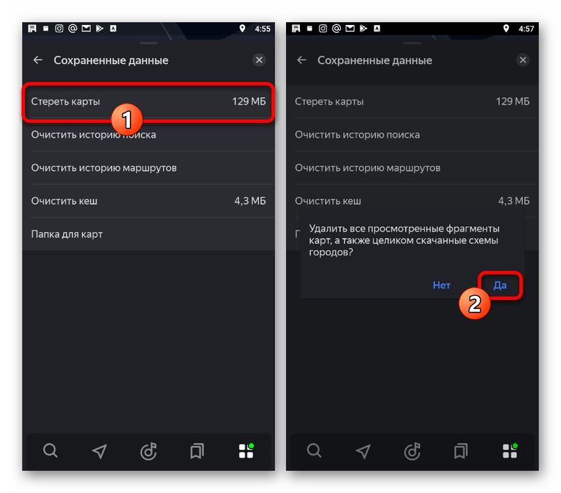 При отсутствии на телефоне нужного объема свободного места можете в том же разделе «Сохраненные данные» произвести очистку скачанных карт с целью освобождения памяти. Учитывайте, что здесь нет возможности выбора отдельных элементов, из-за чего удаляются сразу все добавленные варианты, которые впоследствии, если нужно, придется загружать заново.