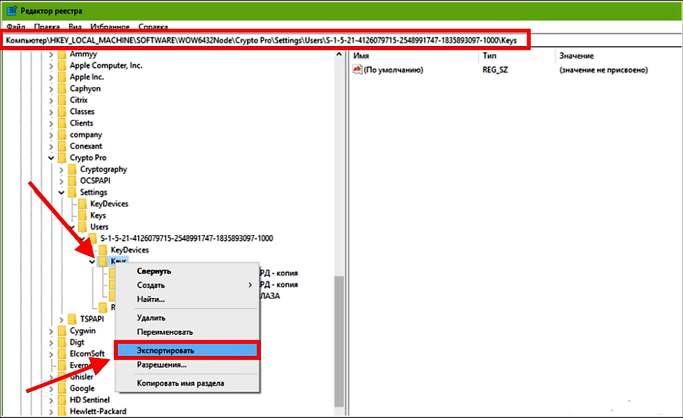 Шаг 2. Скопируйте контейнеры в файл. Зайдите в реестр и скопируйте действующую ветку: \HKEY_LOCAL_MACHINE\SOFTWARE\WOW6432Node\Crypto Pro\Settings\Users\S-1… (подставьте SID)\Keys