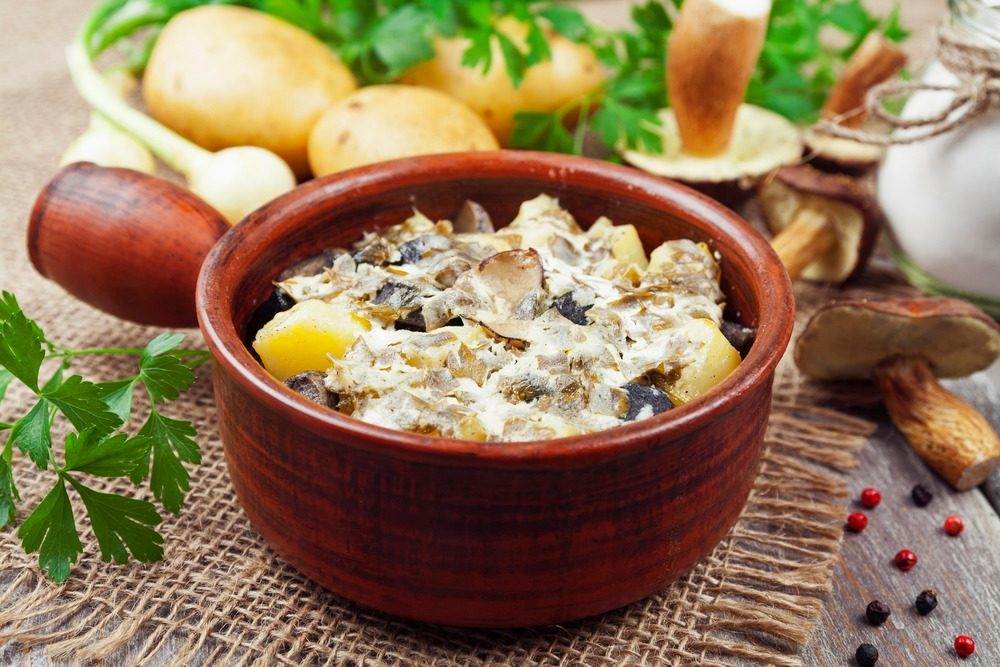 Шампиньоны с картошкой, приготовленные в сметане на сковороде