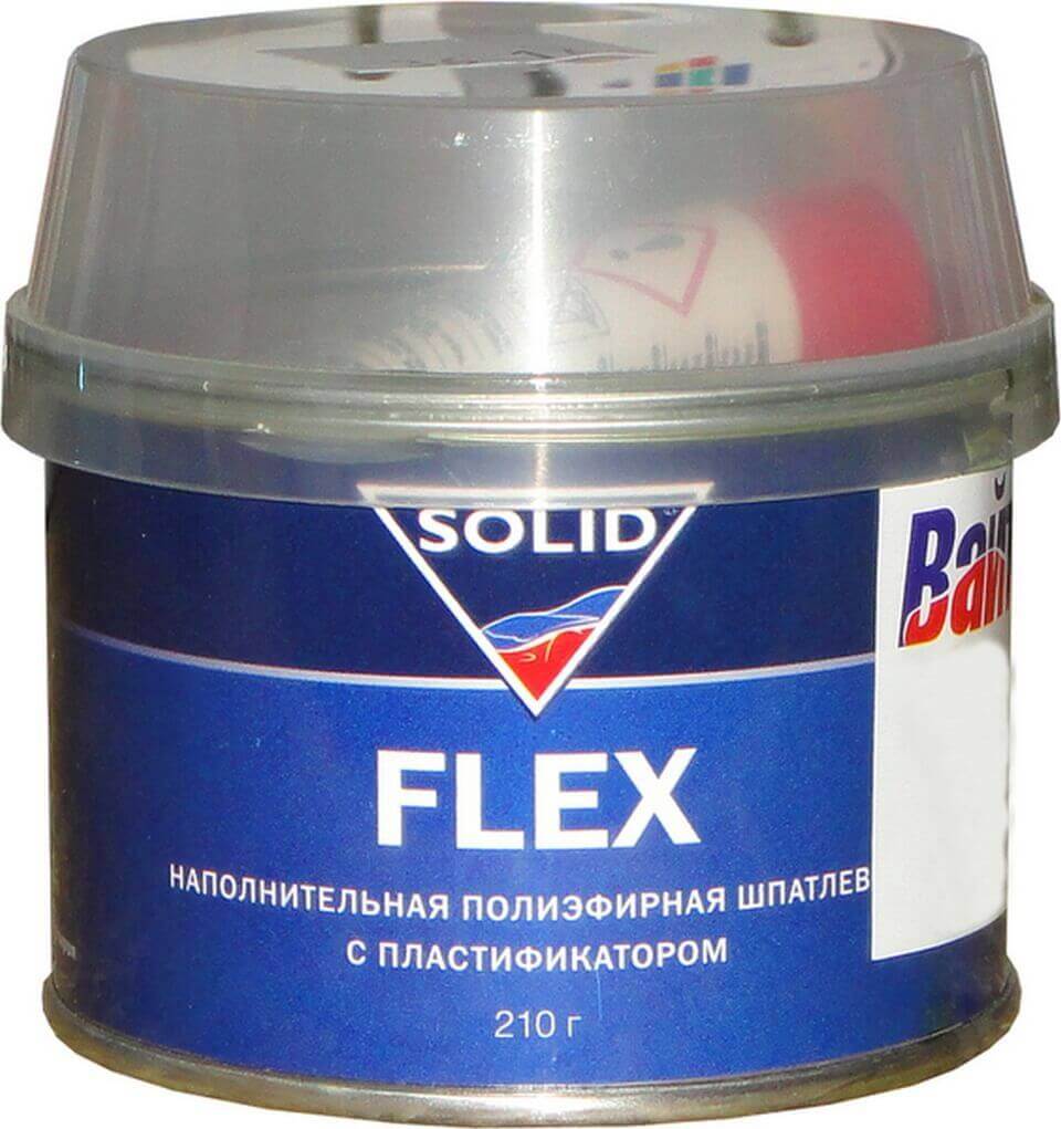 SolidFlex. Позволяет прошпатлевать автомобильную поверхность в течение одного подхода, заполняя микротрещины в пластмассе. Состав хорошо отвердевает на поверхности, что снижает процент прилипания абразивных частиц, а также уменьшает «спружинивание» в процессе дальнейшей шлифовки. Точно подобранное количество наполнителей обеспечивает максимально легкий процесс шлифования. Представлен состав в сером цвете. Он начинает застывать при комнатной температуре уже через 5 минут, а сохнет до получаса. Используется для исправления несовершенств в местах спайки или склеивания пластмассовых комплектующих.