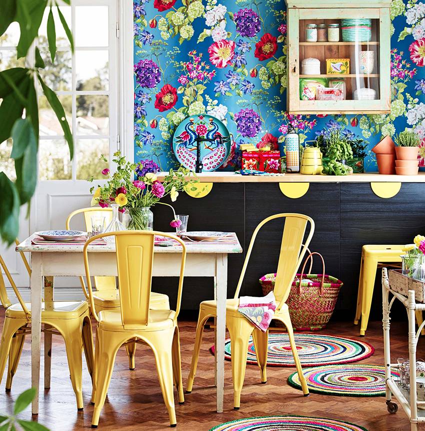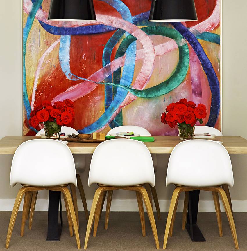 Стену рядом с обеденной группой можно сделать яркой и эффектной