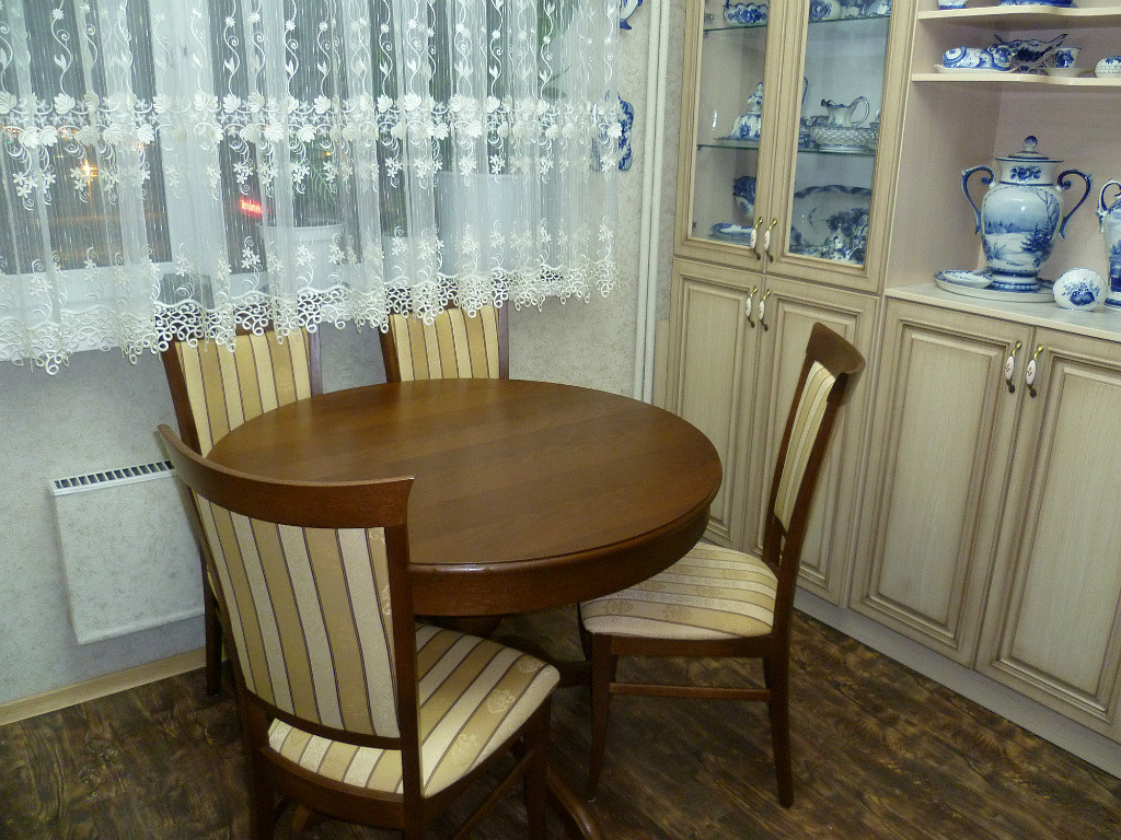 Однако эту модель стоит выбирать только в том случае, если семья состоит всего из двух человек. Плюсы такого стола в том, что его можно прикрепить к одной из стен маленькой кухни, причем сделать это можно всего одной парой ножек (такое решение сэкономит место в помещении).