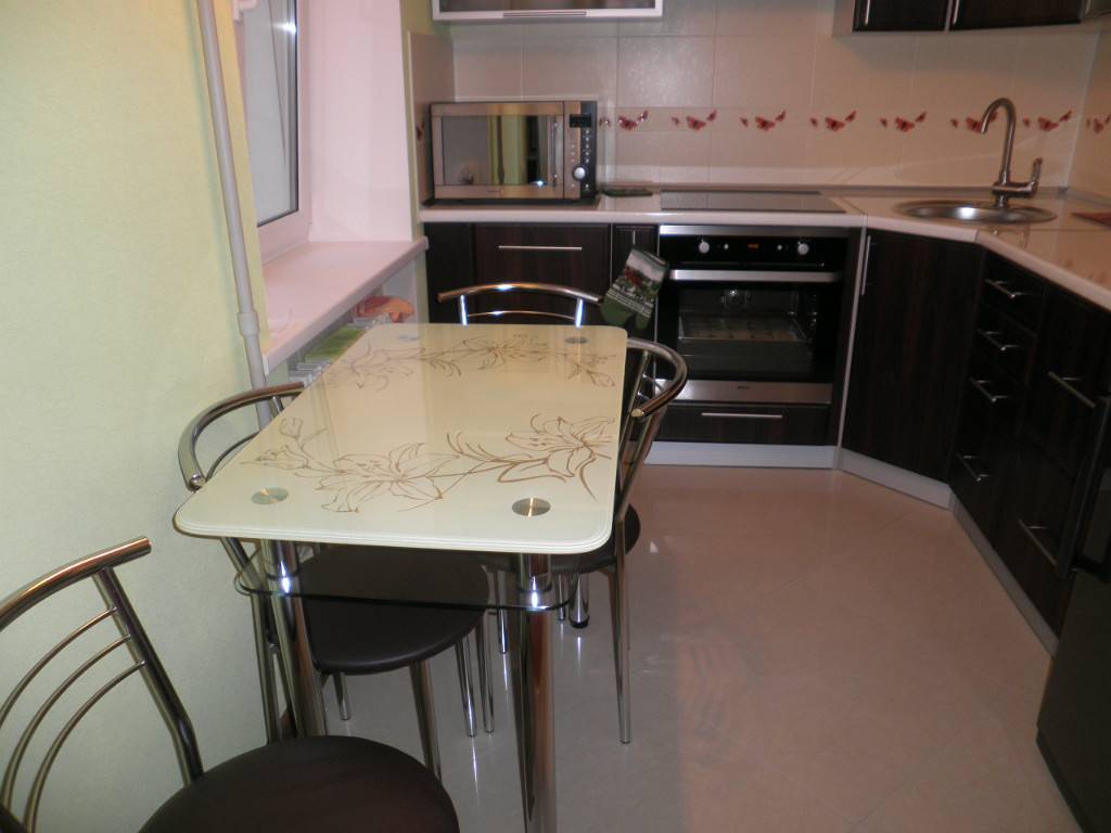 В условиях ограниченного пространства крайне трудно найти для кухни сплошной стол, который бы позволил уместиться 4-5 персонам.