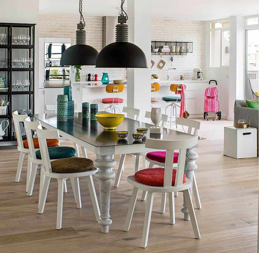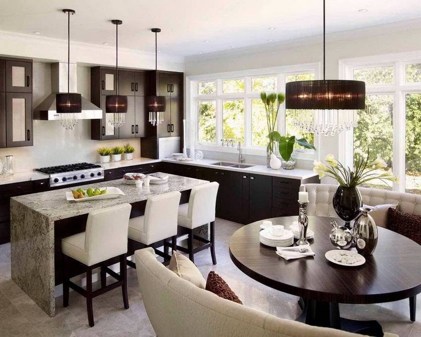 Разнообразие размеров, форм и площади в современной планировке квартиры или дома почти избавила от жестких рамок. Перепланировка уже имеющегося пространства, эффектные комбинации в оригинальных проектах привели к появлению стола и стульев в заранее спланированных зонах, на возвышениях и подиумах, в виде острова.