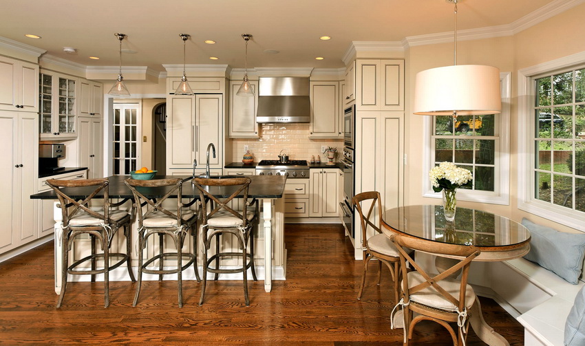 Универсальных рекомендаций, как подобрать стол и стулья к кухонному гарнитуру, не существует. Многое зависит от используемой площади, формы заполняемого пространства, предпочтений хозяина, состава семьи и частоты, с которой кухня выполняет роль столовой для всех ее членов одновременно.