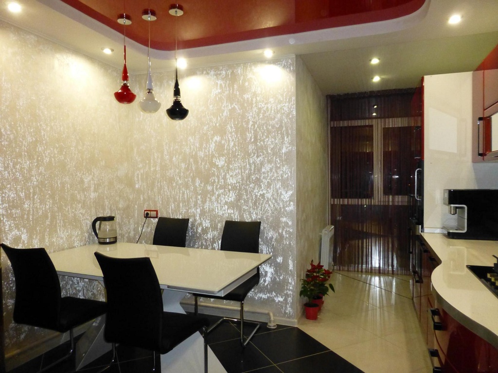 Потолок. На многих фото столовых можно увидеть наличие потолочных элементов, которые отделяют зону от остального пространства. Чаще всего такая конструкция выполняется над столом и повторяет его форму. Дополнительно здесь оборудуют подсветку или устанавливают люстру над столом в кухне.