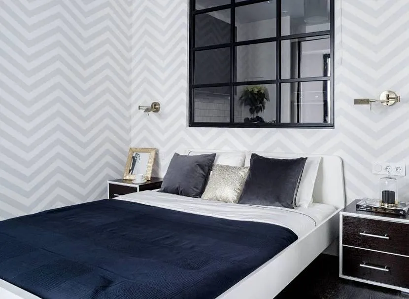 Белый цвет визуально делает большую спальню безграничной. Чтобы нейтральная гамма не навевала скуку, нужны тоновые акценты. Мерцающая краска, обои с серебристым узором смотрятся очень необычно. В северных помещениях дизайнерский прием зрительно добавит освещения. Уберут ненужную стерильность в светлой комнате акцентный потолок или горизонтальные серые зигзаги.