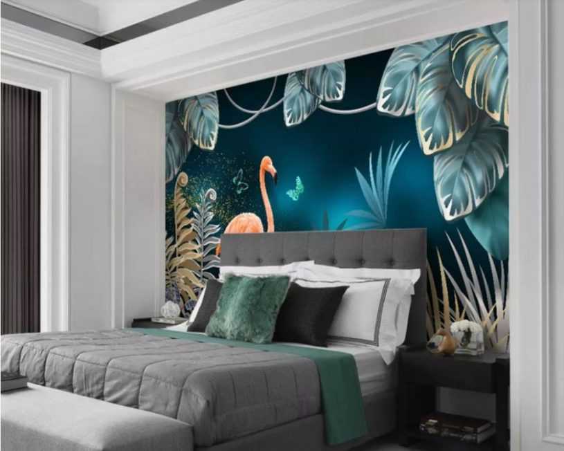 Бирюзовый цвет на стенах в спальне роскошно смотрится с любым светлым дополнением. Насыщенный, сочный оттенок выделяет белые фасады мебели, растительные узоры на обоях и фактурные акценты на поверхностях. Тон можно гармонично сочетать с серыми (серебристыми) и черными деталями.