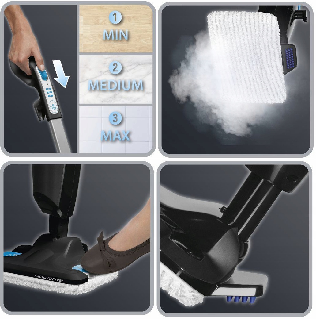Эта паровая швабра имеет возможность похвастаться функциями, которые доступны немногим подобным приборам. В первую очередь стоит отметить съёмный резервуар для воды, который можно снять и быстро наполнить, не отключая устройства и не прекращая подачи пара. Полностью заполненный бак объёмом 350 мл. обеспечивает непрерывную работу в течение 12 минут. Также не стоит оставлять без внимания быстрый нагрев, уже через 15 секунд после включения швабра готова к работе. Есть функция защиты от накипи и регулировки пара.