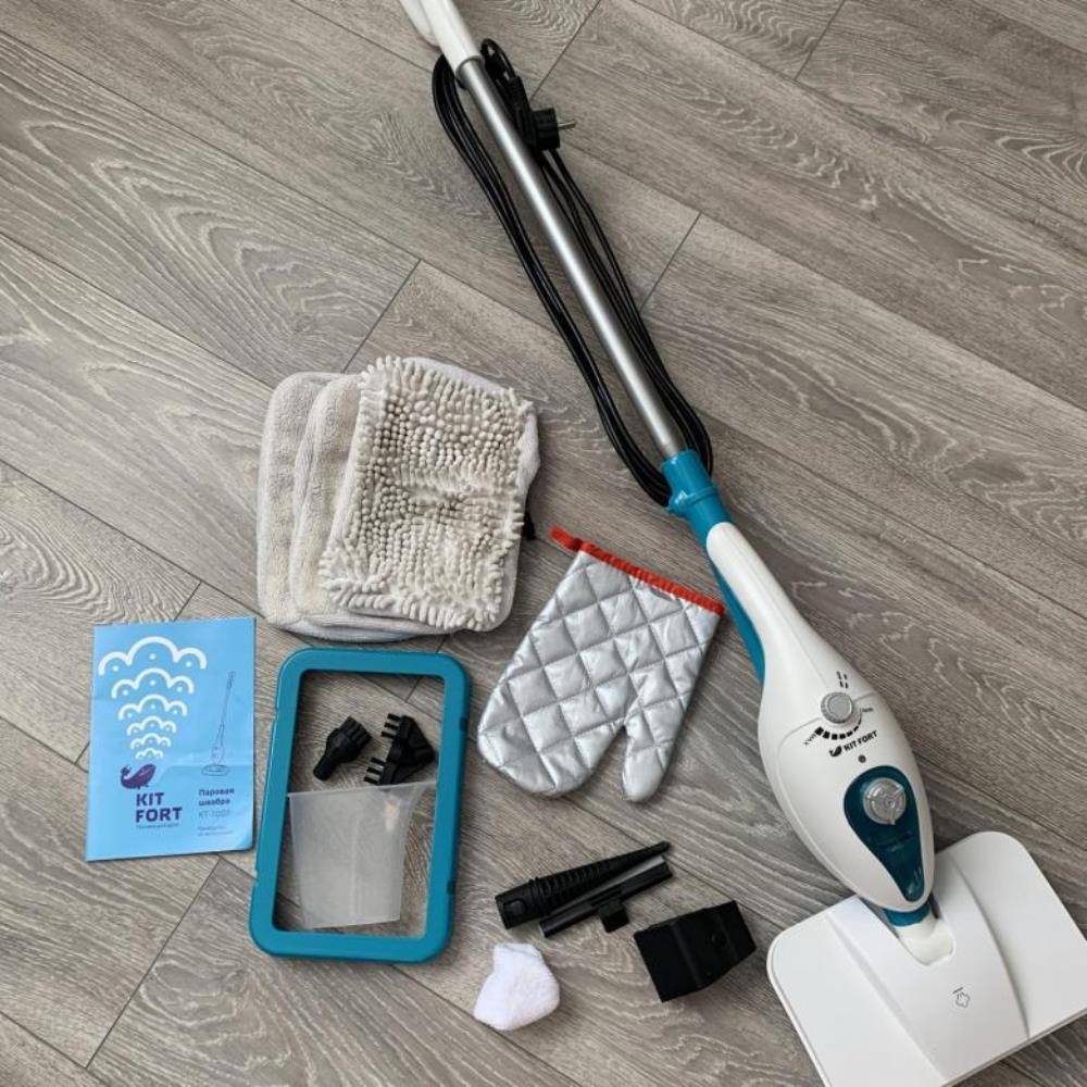 Компактная швабра весом около 2,5 кг. Подходит для устранения небольших загрязнений в доме или квартире. В комплект входит много разных насадок и дополнительных аксессуаров: ворсовая щетка, тряпки для мытья пола, отпариватель одежды, рамка для фиксации салфеток, насадка-скребок для очистки от засохшей грязи.