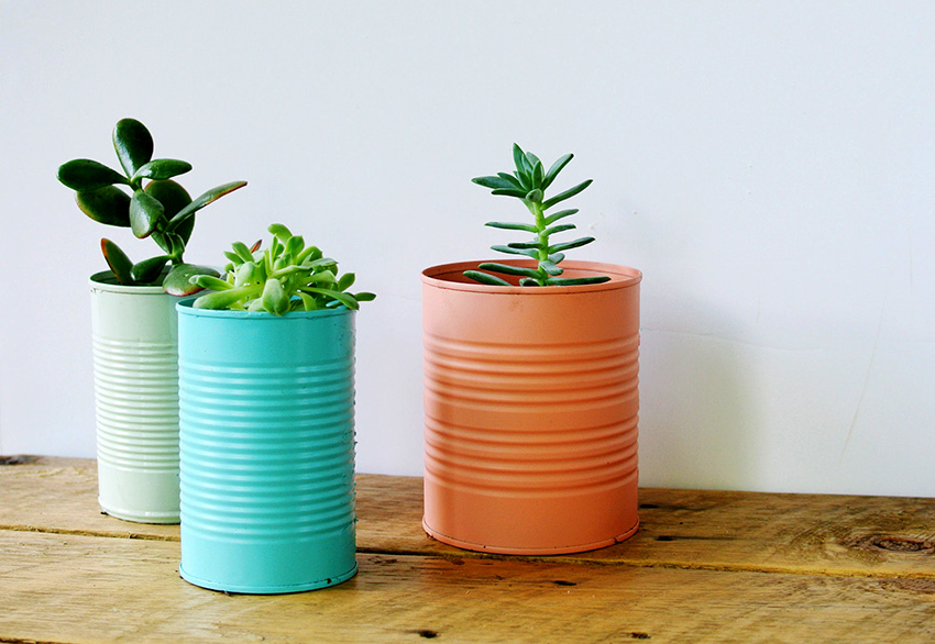 Оригинальные настольные горшки под цветы из жестяных банок
