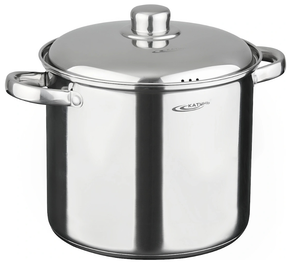 Эта модель станет оптимальным решением для хозяек, которые занимаются консервацией. Для изготовления применяется нержавейка. Объем резервуара – 13 л. Этого показателя более чем достаточно не только для компотов, варенья и солений, но и для стерилизации банок. Материал не вступает в химическую реакцию с продуктами в процессе их приготовления. Дно у изделия толстое и оснащено специальной алюминиевой вставкой. Это высокотехнологичное решение позволило добиться максимально равномерного распределения тепла в процессе ее эксплуатации. Ручки короткие, удобные в использовании.
