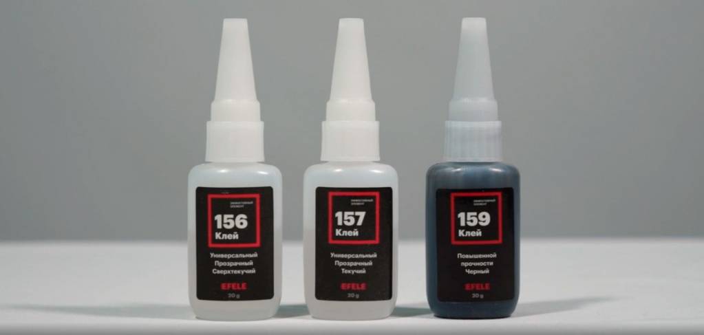 Cамый вязкий цианакрилат из представленных в линейке – EFELE 159. Он предназначен для заполнения зазоров около 0,5 мм. Материал отличается черным цветом и высокой ударопрочностью. Диапазон его рабочих температур на 10 градусов шире, чем у других клеев EFELE (до -40 °С). Для отверждения EFELE 159 требуется от 20 секунд (резина) до 120 секунд (металл).