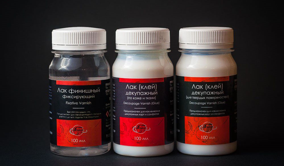 предлагает качественный декупажный клей-лак, изготовленный на основе акриловых смол. Благодаря такому составу лак долгое время остаётся прозрачным, не желтеет, не меняет цвет при термообработке. Существует два основных вида декупажного клей-лака: для работы по твёрдой поверхности и для работы по ткани.