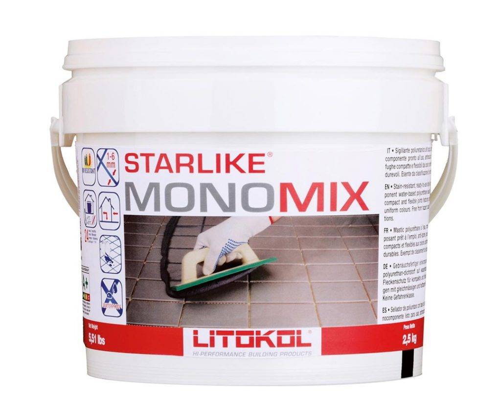 Полиуретановая затирка. Эта разновидность затирочных смесей имеет фирменное название Starlike MonoMix и представляет собой однокомпонентный состав полиуретановых смол на основе водной дисперсии. Реализуется в готовом для использования состоянии и подходит для обработки швов толщиной от 1 до 6 мм.