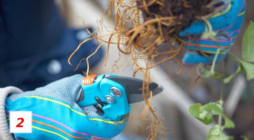 Если наземная часть растения по размеру больше корневой системы, ее укорачивают (3).