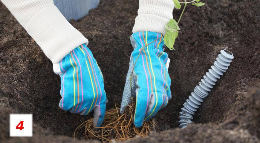 На дне посадочной ямы насыпают холмик из подготовленной грунтовой смеси, по нему равномерно расправляют корни клематиса (4), присыпают небольшим количеством грунта и поливают.