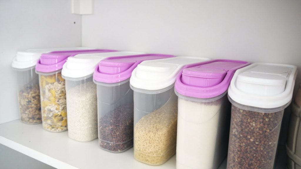 Для круп, спагетти, макарон и других сыпучих выпускают специальные емкости – обычно они прозрачного цвета, оснащены удобной крышкой для пересыпания продуктов. Материалом изготовления может служить пластик, стекло, металл. В таких банках удобно хранить крупы – плотно закрывающиеся крышки не допускают проникновения влаги и пыли.