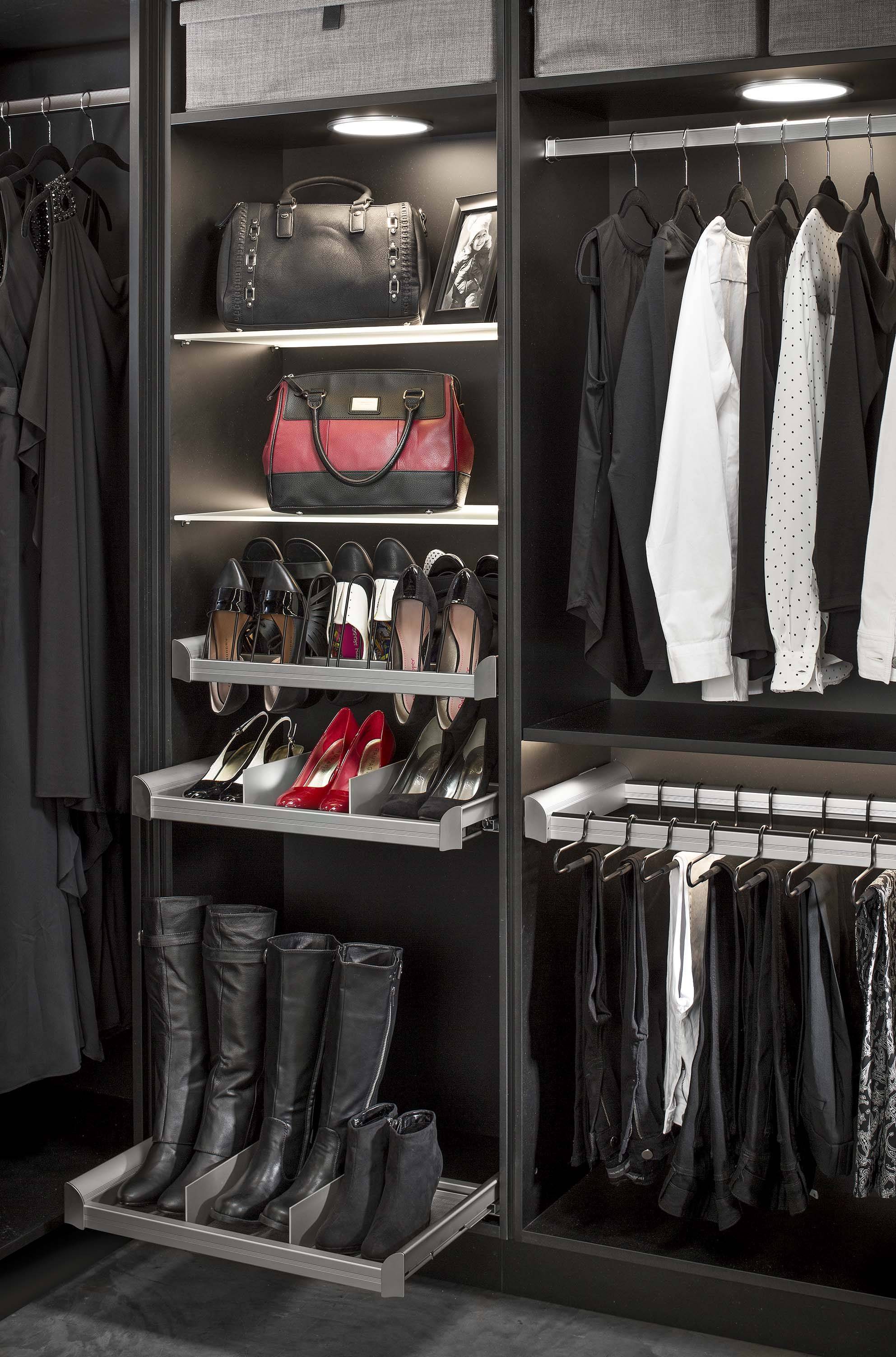 В подвешенном состоянии высокая обувь хранится в тех же полках или шкафах, если они имеют специальную штангу.