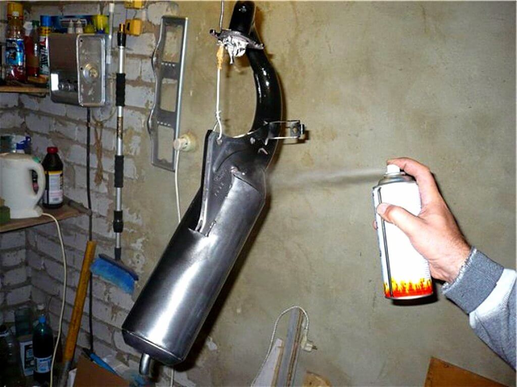 При окраске пульверизатором нужно соблюдать одинаковое расстояние до глушителя, не менять угол покраски. Эмаль должна покрывать все границы детали.