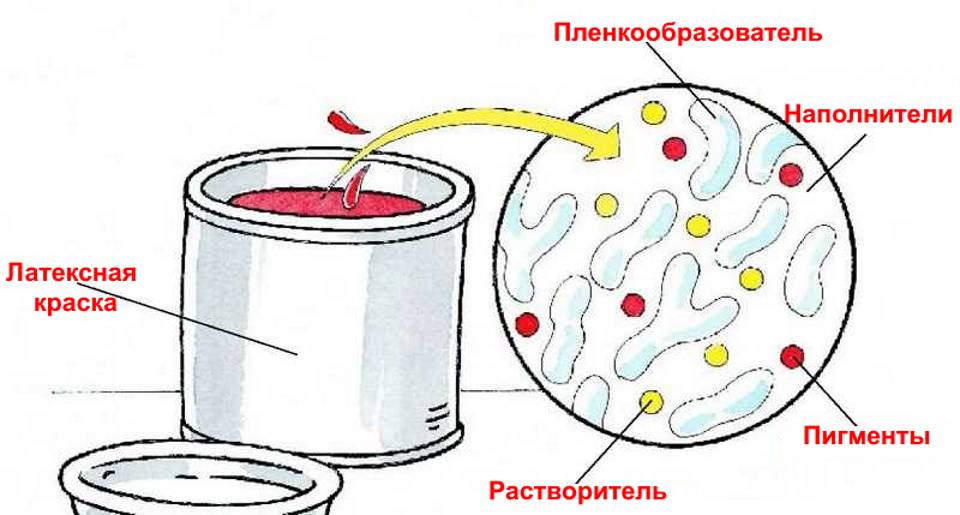 Нерастворимые компоненты (пигменты, полимеры) удерживаются на расстоянии и между собой в водной среде не слипаются. Такое состояние поддерживают диспергирующие компоненты, обеспечивающие стабильную консистенцию материала.