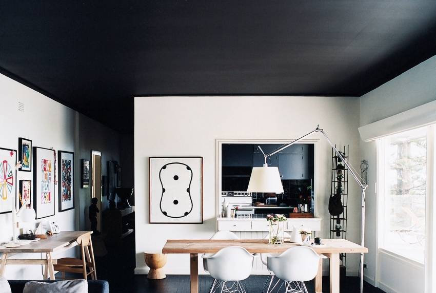 Выбор краски для потолка зависит от стилистики помещения и его габаритных размеров.