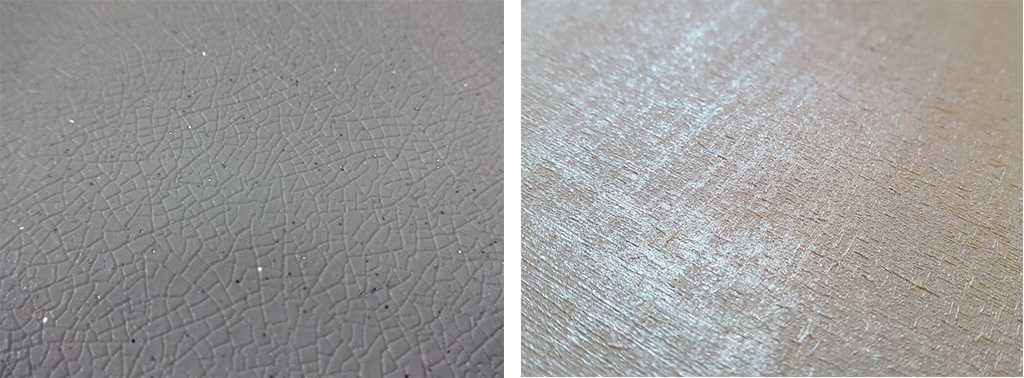 Состав может содержать глиттер, и покрытая им поверхность становится перламутровой.