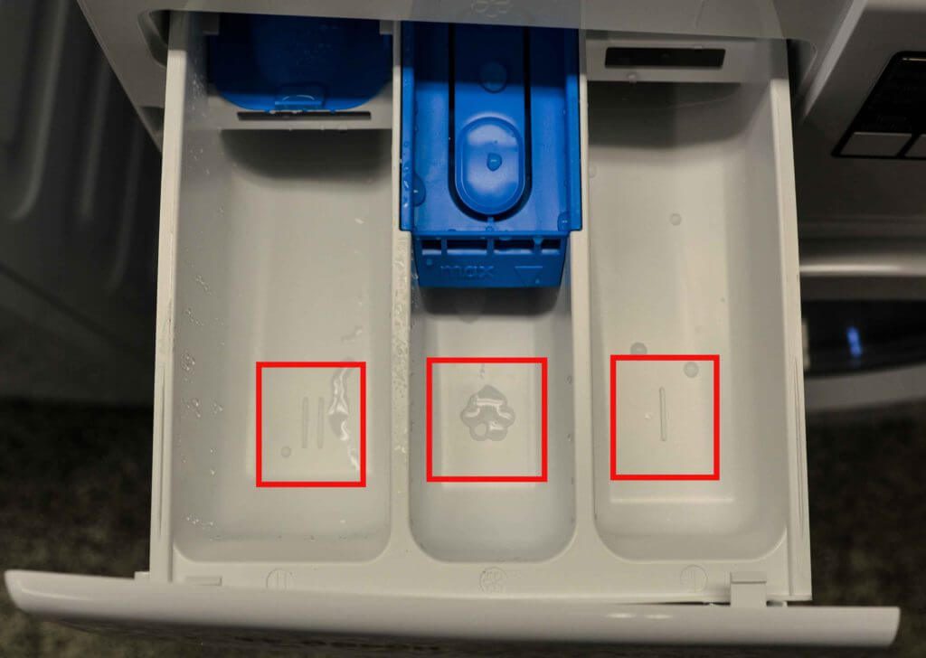 Стиральные машинки оснащены 3-секционным лотком. Левое отделение – для основной стирки, правое – для дополнительной. Секция для кондиционера окрашена в синий цвет.