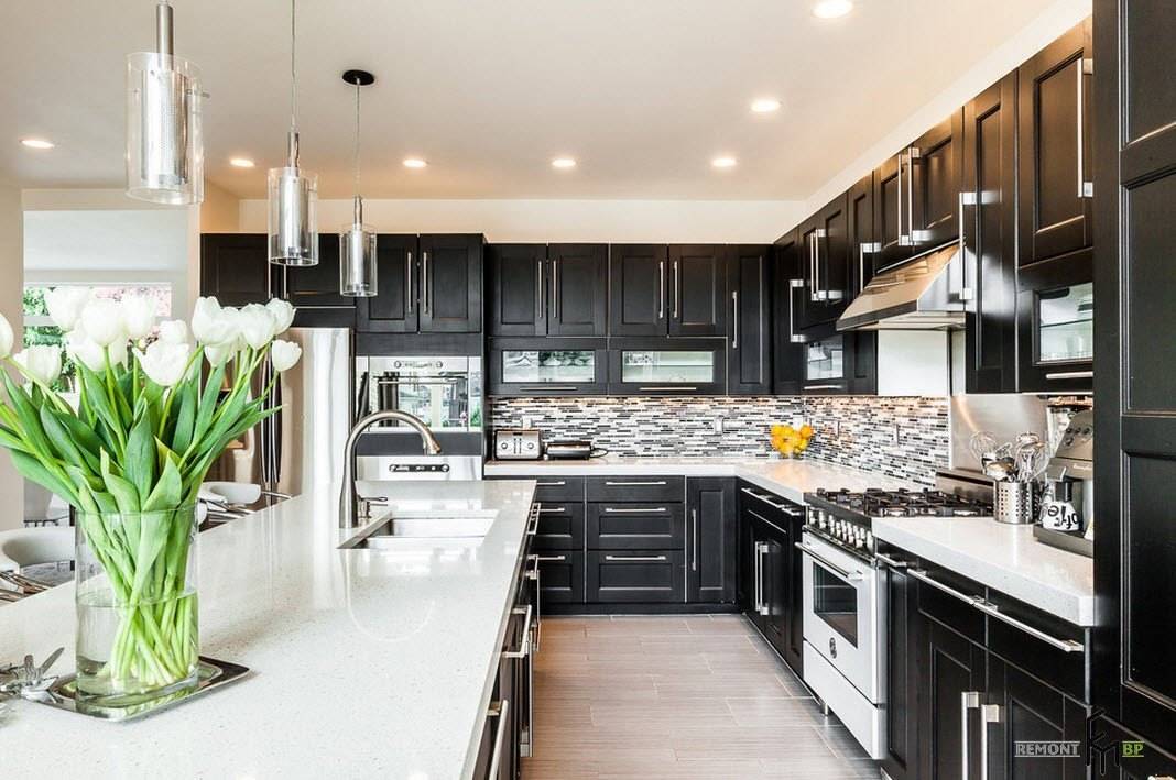 Отделка кухни с чёрно-белым гарнитуром