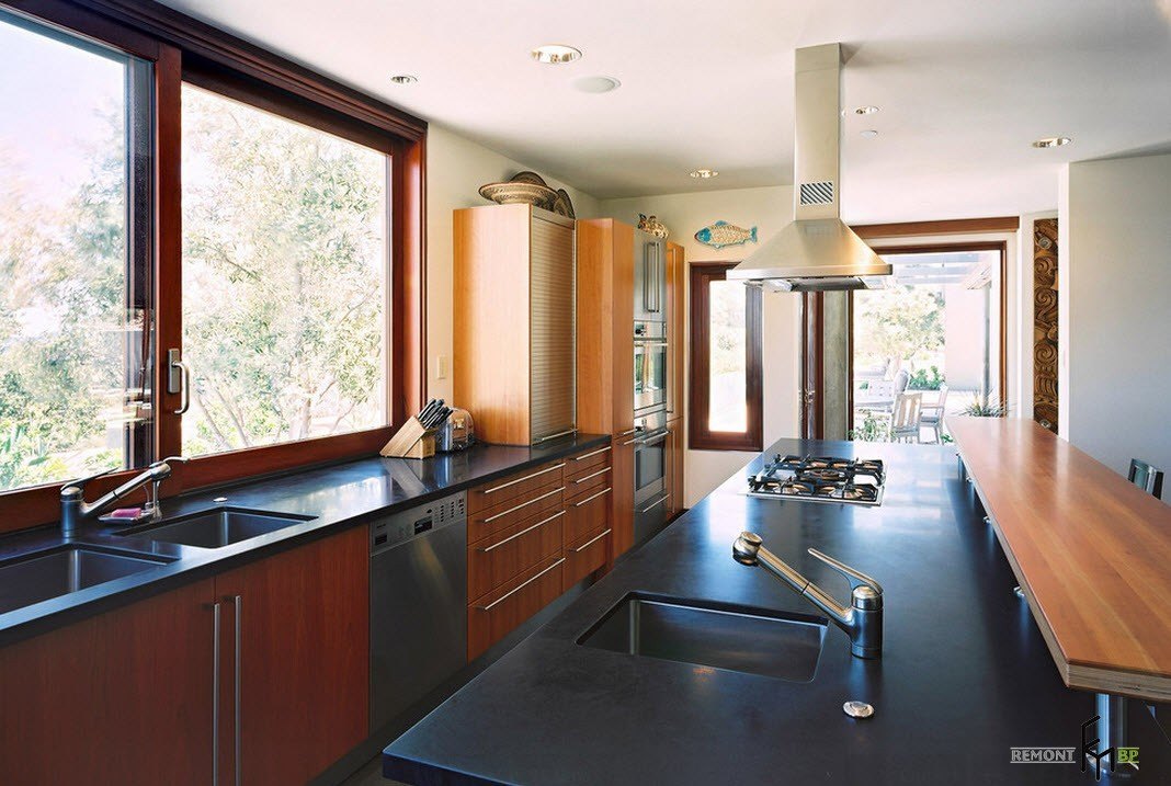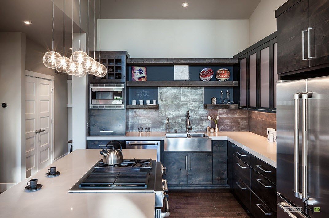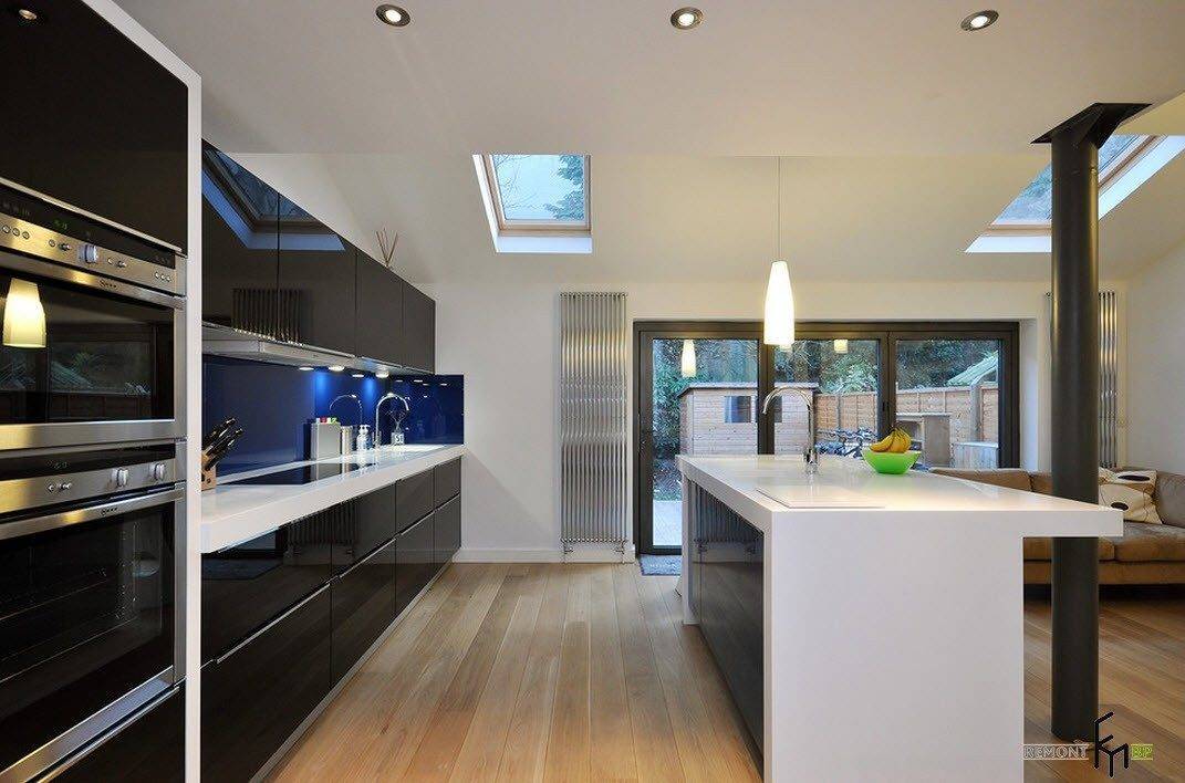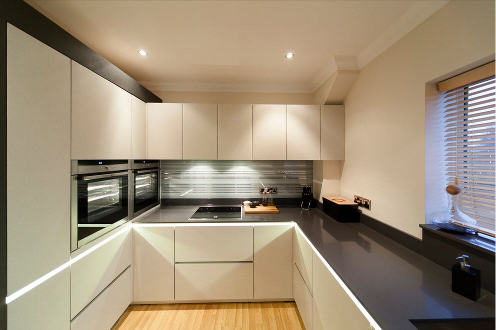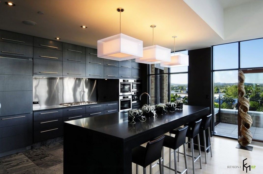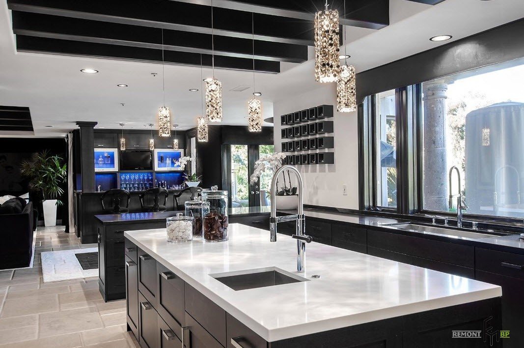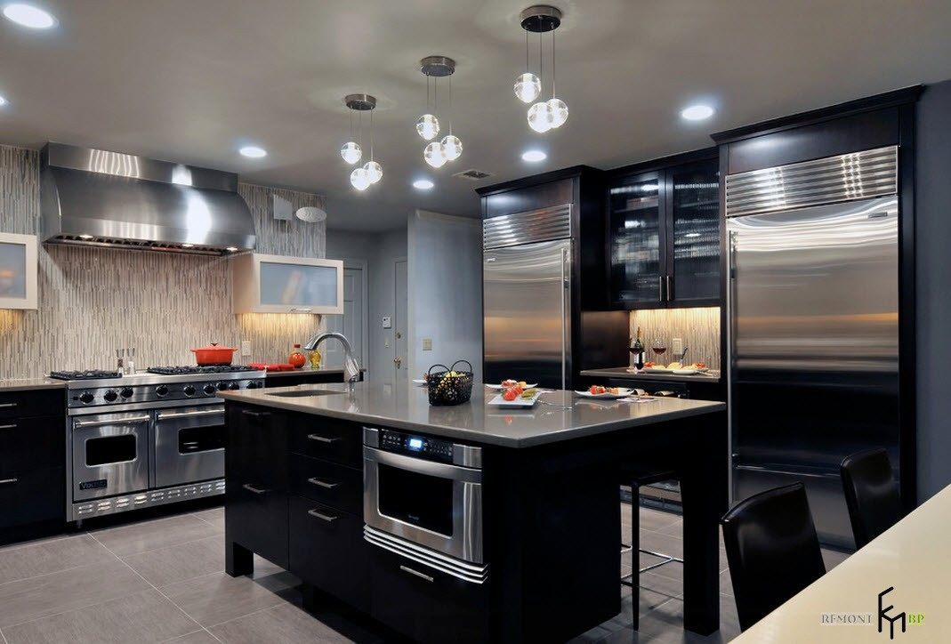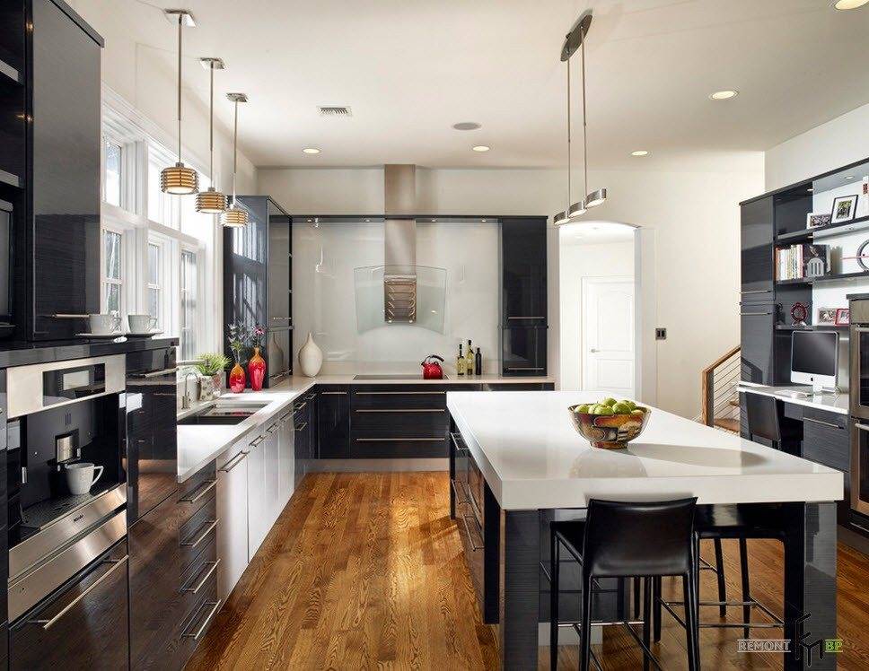 На потолке, который допустимо сделать глянцево-черным, присутствует несколько точечных светильников, над столешницами, одна из которых – островная, размещают лампу на длинном шнурке.