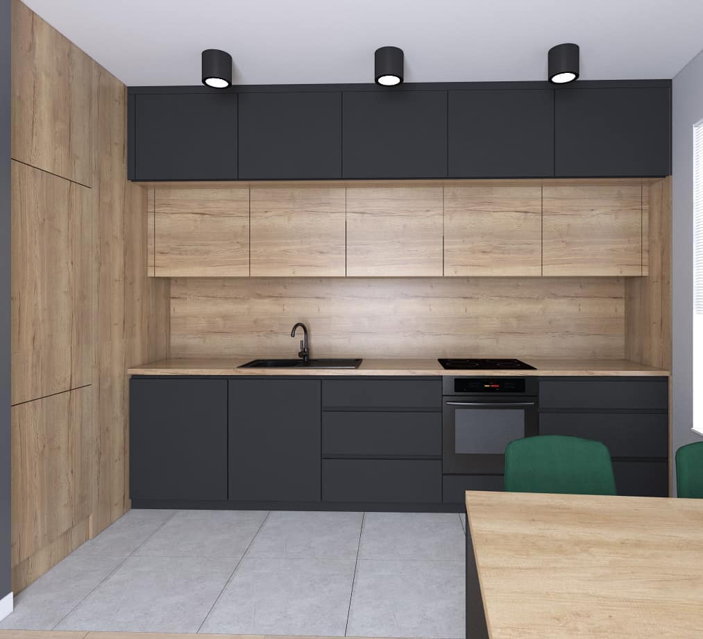 - Черным лучше сделать небольшие поверхности — несколько шкафчиков, пара стульев.