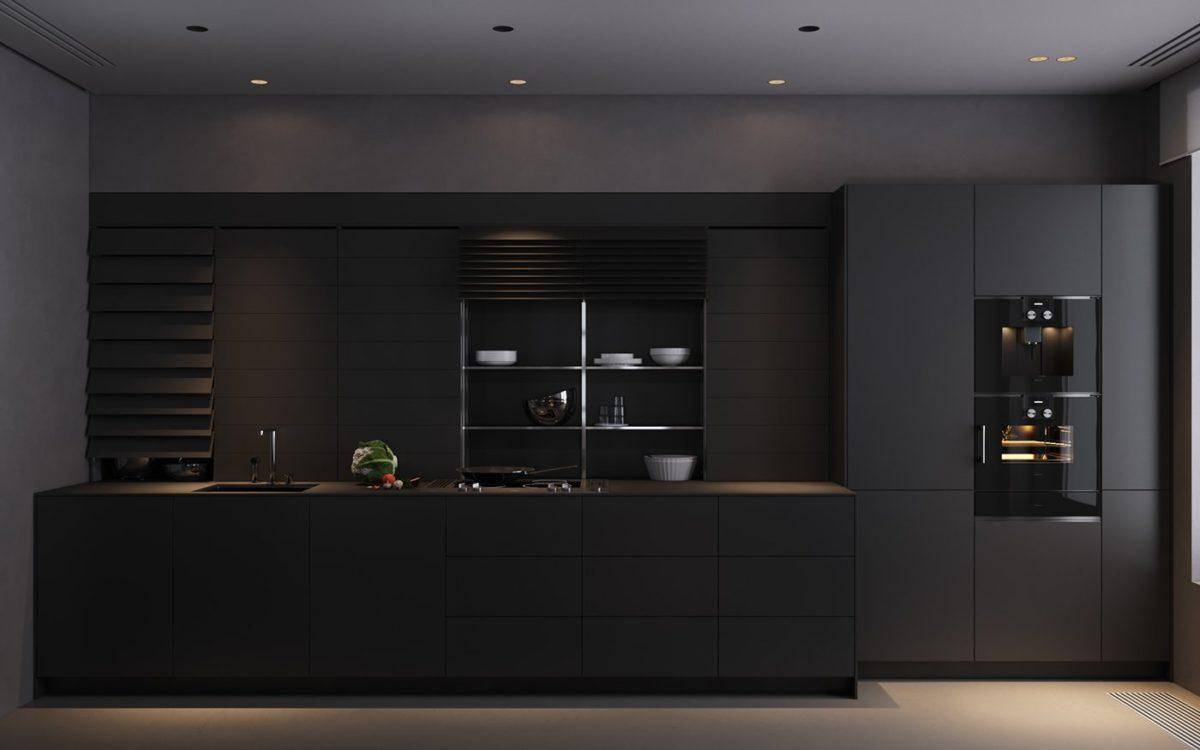 Черный выгодно комбинируется с серебристыми тонами, которые применяются в исполнении раковины из нержавейки, холодильника, духовки или других бытовых приборов со стальными корпусами. Темные фасады для зрительного объема можно украсить матовыми стеклами, обрамленными профилем из алюминия.