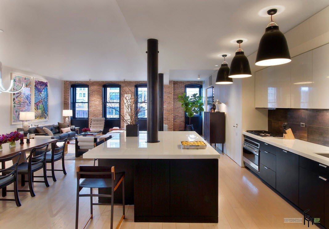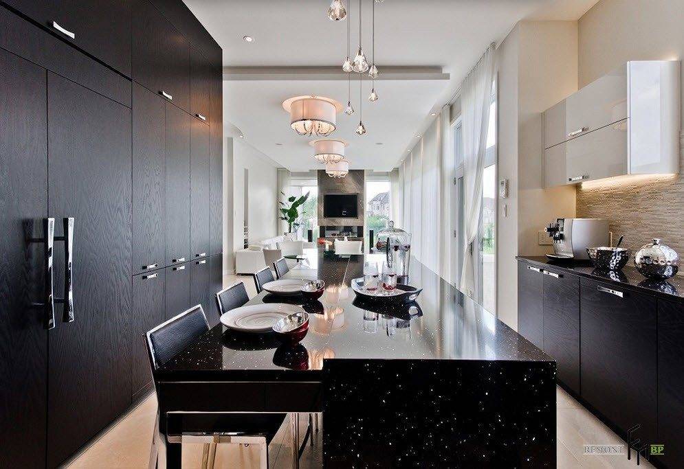 На следующем фото просторное помещение совмещает в себе зону кухни, гостиную и столовую. Здесь черный вовсе не утяжеляет интерьер, а выступает идеальным контрастом. Прекрасное сочетание нижнего яруса черной мебели с белоснежным верхом столешниц и шкафов привносит гармонию в стильную и уютную кухню.