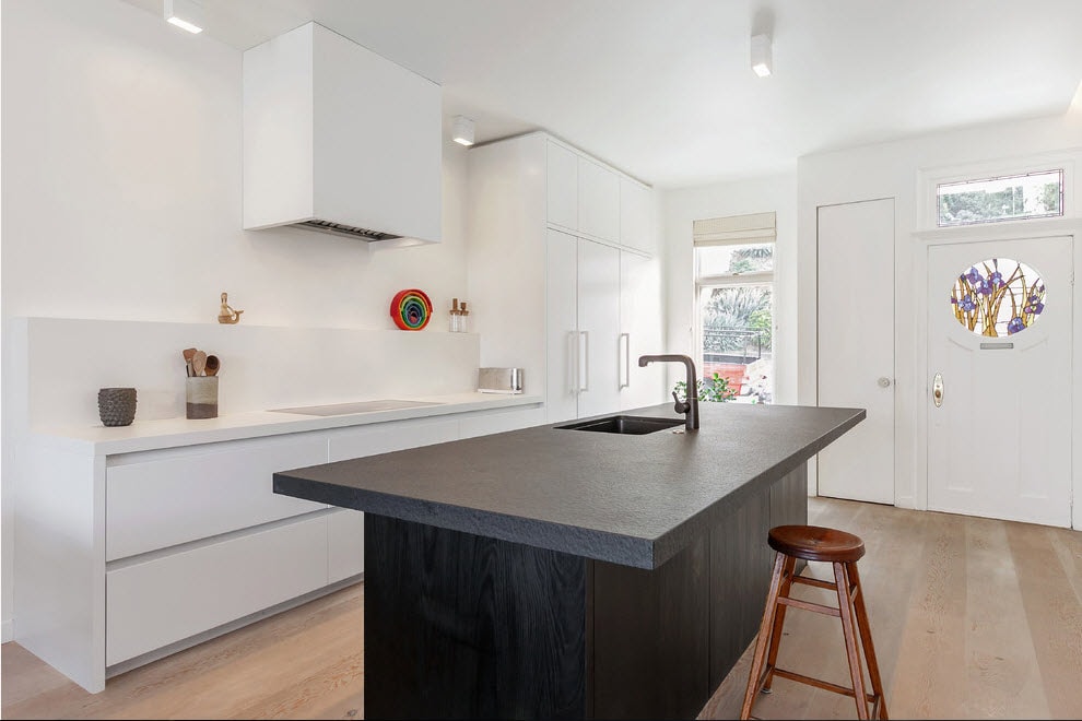 Для небольших помещений более подходящим вариантом монохромного интерьера станет дизайн с преобладанием белого цвета. Он способен визуально расширить пространство и добавить свежести. Если кухня большая, то могут доминировать черные поверхности. В этом случае следует позаботиться о достаточном освещении, особенно в зоне приготовления пищи.