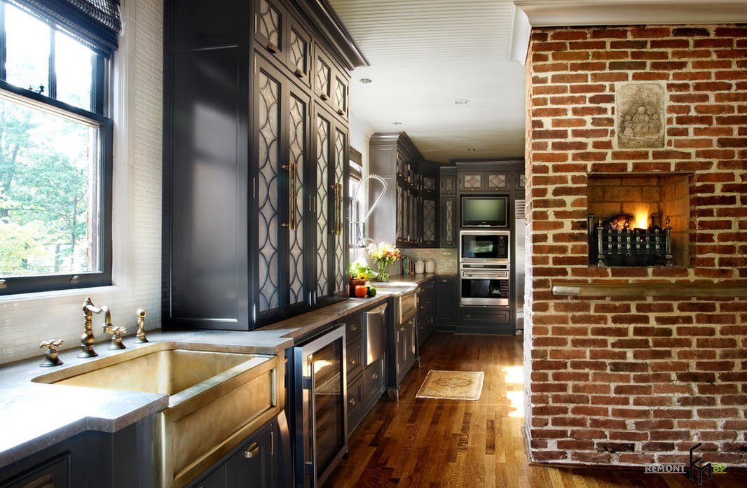 Одну из стенок выкладывают черной керамической плиткой «под кирпич». Мебель предпочтительна темная, матовая, старинная или псевдостаринная, патинированная. Светильники подвешиваются на длинных шнурах или цепях, обои, при их наличии, имитируют сырую штукатурку, «голый» кирпич.