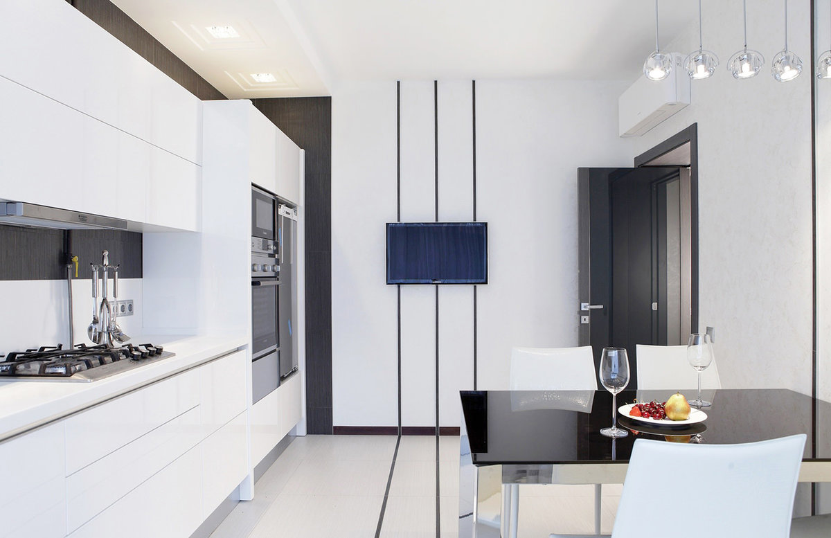 Шикарный интерьер кухни в стиле хайтек. Оформление в черно-белом варианте.