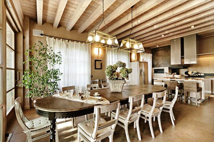 Ну и, наконец, потолок. Лучше всего в интерьер впишутся потолочные балки. Если вы живете в обычной квартире – это не повод отказываться от балок. Вы можете выполнить их своими руками из полиуретановых элементов, которые продаются в строительных магазинах. Потолок под балками можно выкрасить обычной белой или бежевой краской, а сами балки, разумеется, стилизовать под древесину. Что же касается крепления балок, можно, конечно выполнить его с помощью клея. Это вариант быстрый, простой и дешевый. Но более надежный способ – крепление на специальный каркас.