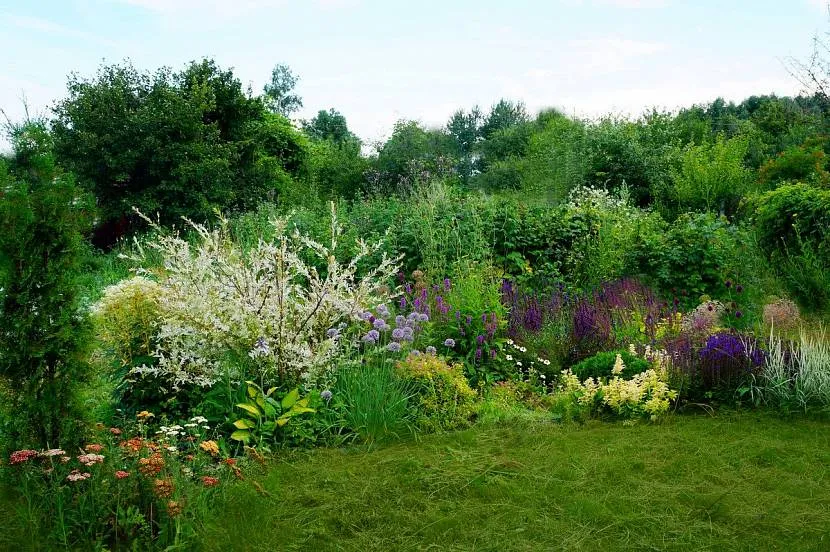 - Миксбордер в деревенском или кантри-стиле состоит из пышно цветущей растительности. Для него характерны пряные травы, пионы, хризантемы, крыжовник, смородина, мелисса.