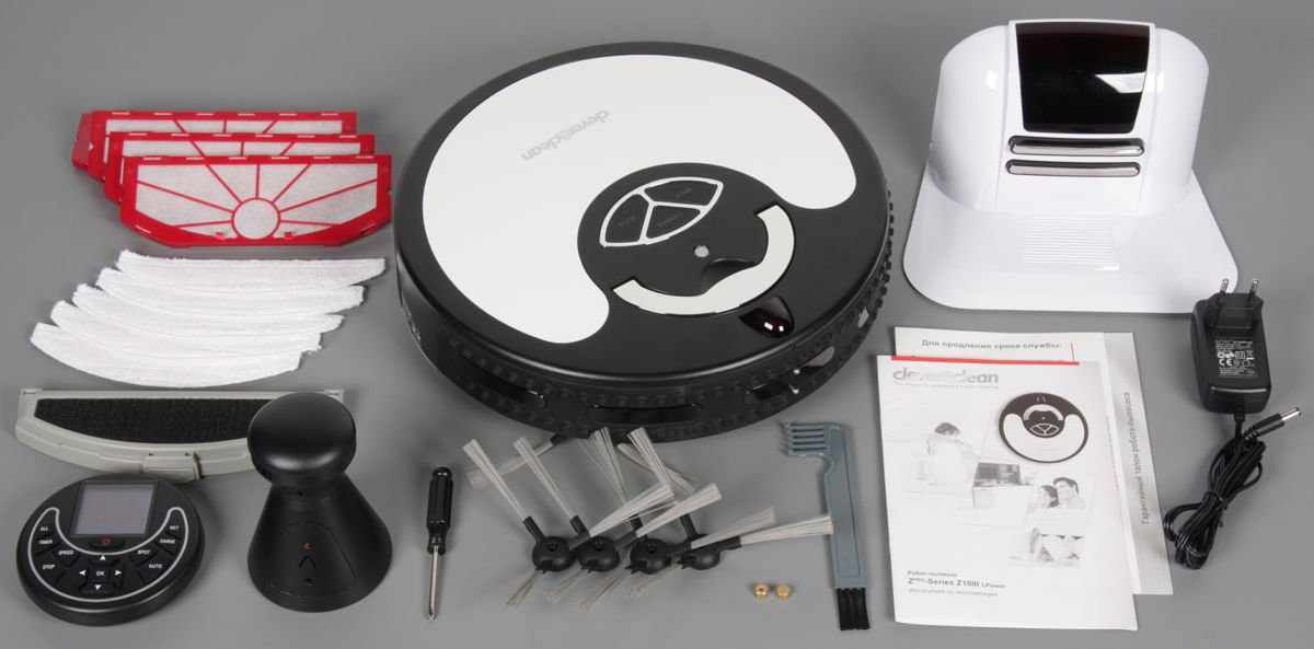 В комплекте к нему идёт панель для влажной уборки, 4 фильтра и столько же запасных боковых щёток, аккумулятор, адаптер, пульт с дисплеем, отвертка и «виртуальная стена».