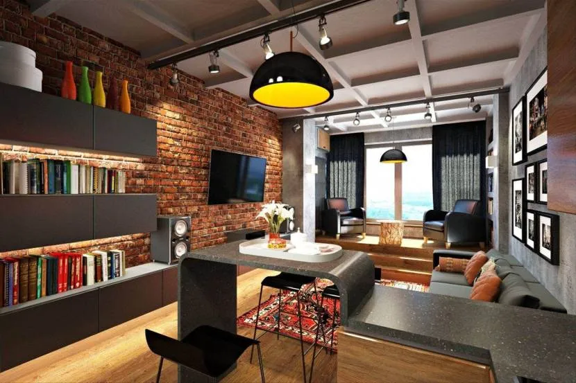 - Отделка простая и грубоватая. Популярный ход – бетонные или кирпичные стены, или отделка штукатуркой под шероховатый бетон.