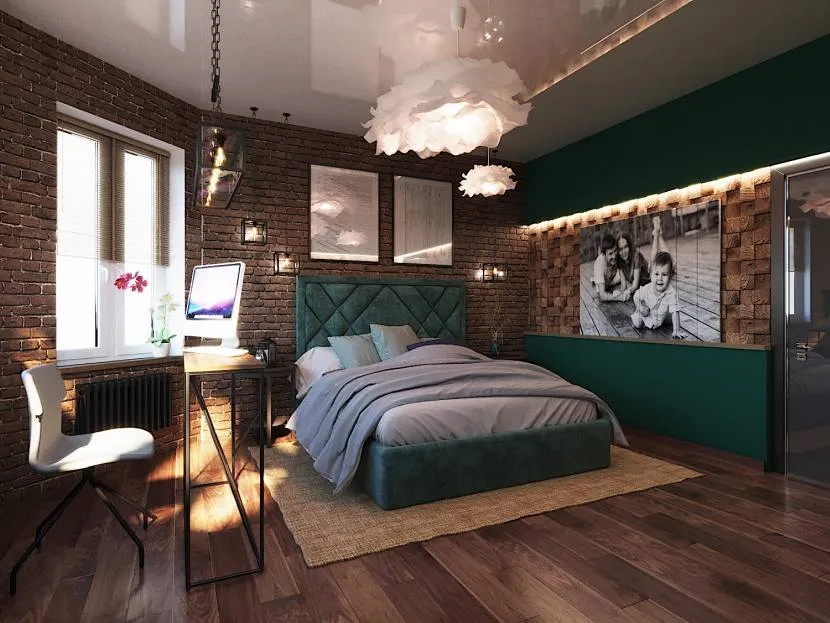 Дизайн потолочной люстры гармонично сочетается с общим интерьером спальни в стиле Лофт