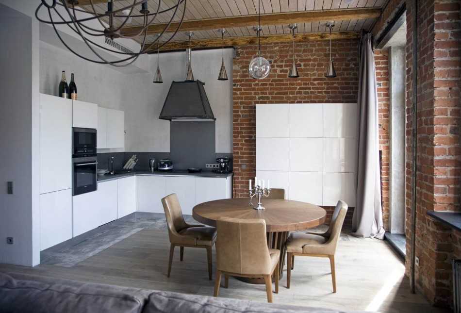 В помещение лофт используют множество светильников. Поэтому кроме центральной люстры нужны другие источники света. Их размещают на потолке, так они хорошо освещают все уголки кухни и не мешают. Иногда вместо одной центральной люстры используют несколько одинаковых потолочных светильников, подвешенных на разной высоте.