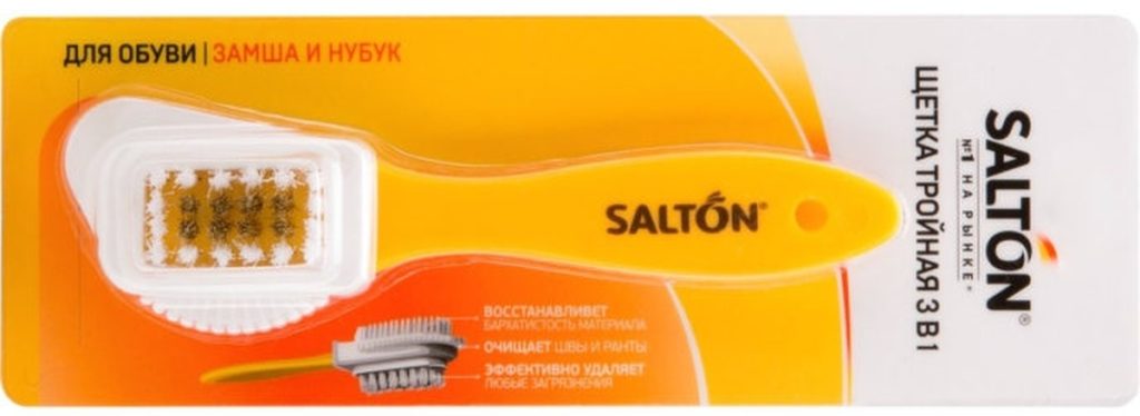 Salton для замши имеет три рабочие поверхности, одна состоит из ворса и латунной проволоки, которые быстро и качественно очищают материал. Боковые части щетки из резины и предназначены для очистки швов и ранта, третья часть представляет собой резиновые ворсинки, при помощи которых можно восстановить бархатистость поверхности.