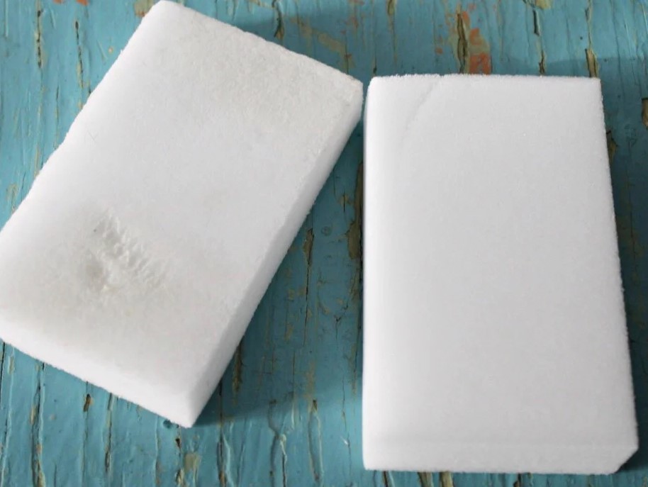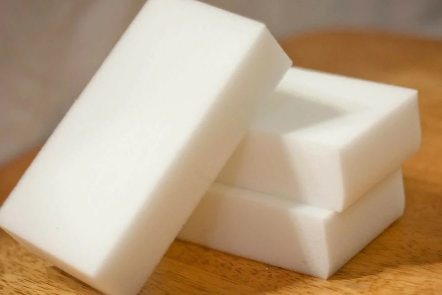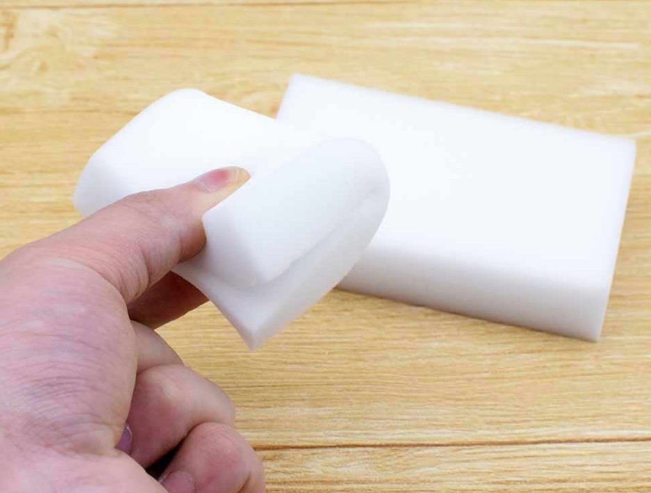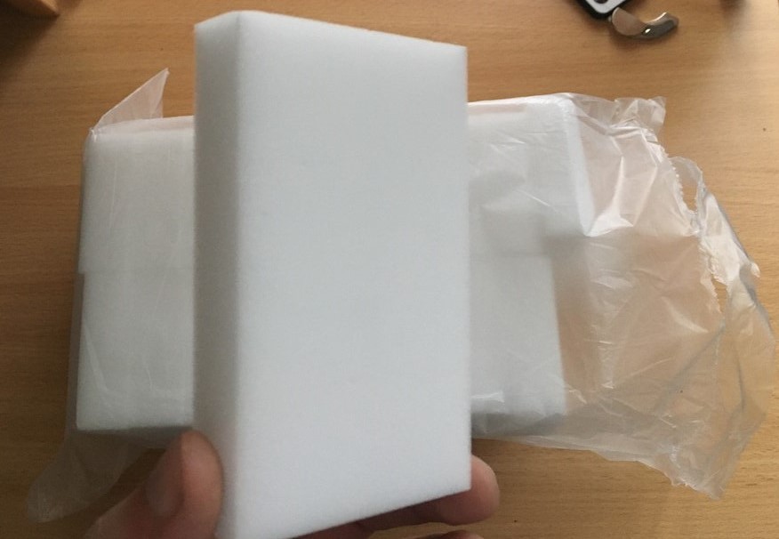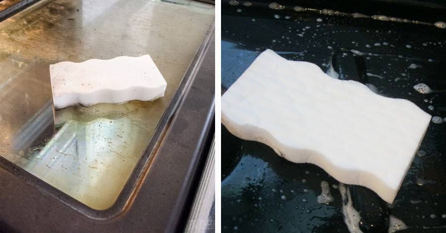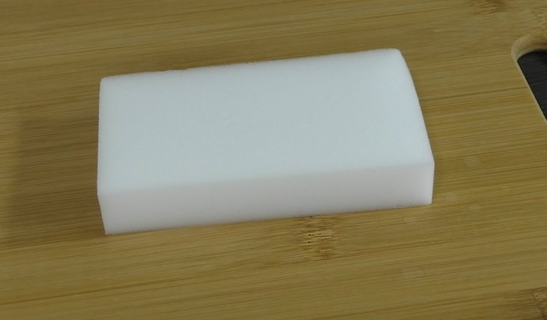 Чистка без использования гелей и порошков для мытья посуды подразумевает использование меламиновой губки. В основе материала лежит меламиновая смола. При взаимодействии с водой образуется достаточное количество пены, которая удаляет жир.