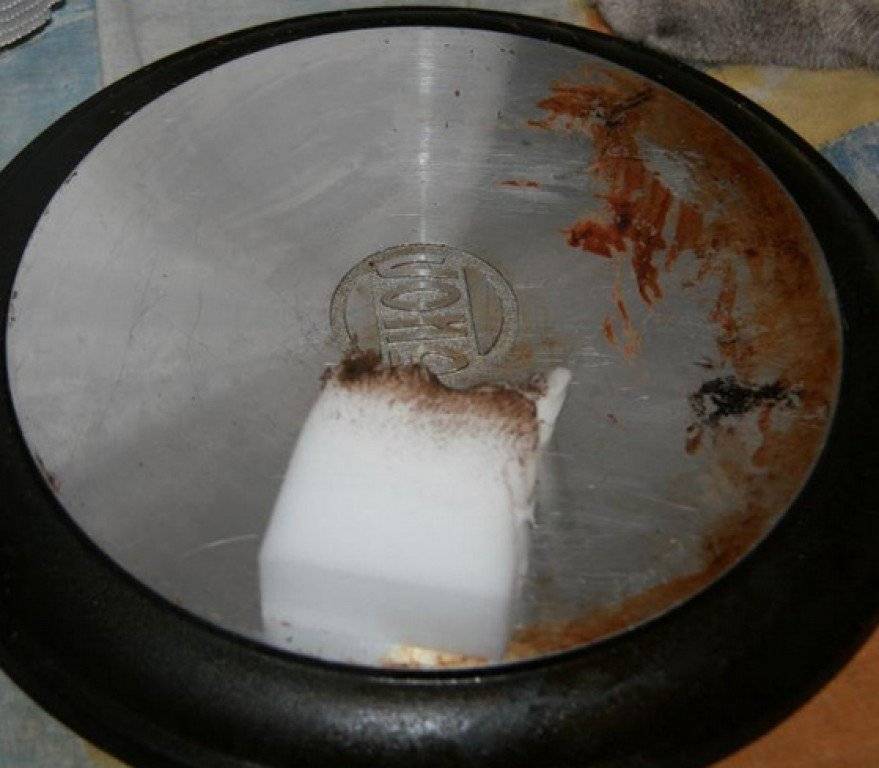 Сковороды, кастрюли, пригоревшую посуду надо чистить жесткой стороной.