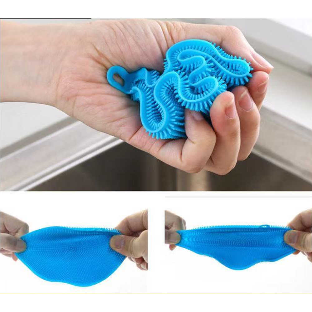 - Силиконовая. Такая продукция не впитывает запахи, не накапливает бактерии, не деформируется, быстро сохнет, отличатся долговечностью, стойкостью перед высокой температурой и безопасностью. Однако модное изделие обладает рядом отрицательных характеристик: силиконовая щетка достаточно плохо задерживает моющее средство, а также сильно скользит в руке во время мытья посуды. Кроме этого, мочалкой из силикона крайне тяжело отмыть сильные загрязнения.