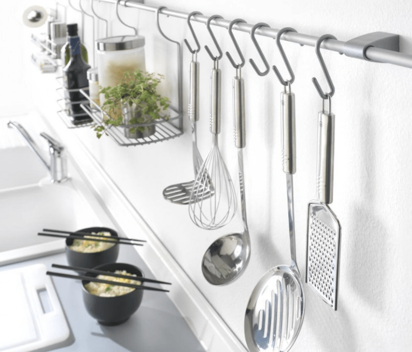 Если сделать металлическое крепление и добавить крючки, места для хранения станет еще больше. Рейлинги — классика жанра для любой кухни .